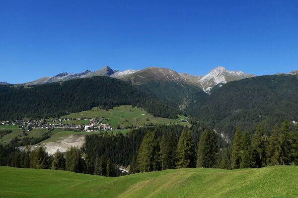 Von Filisur aus Richtung Schönboden hat man zunächst weite Ausblicke auf die Orte Schmitten und Wiesen auf der anderen Seite des Landwassertals.