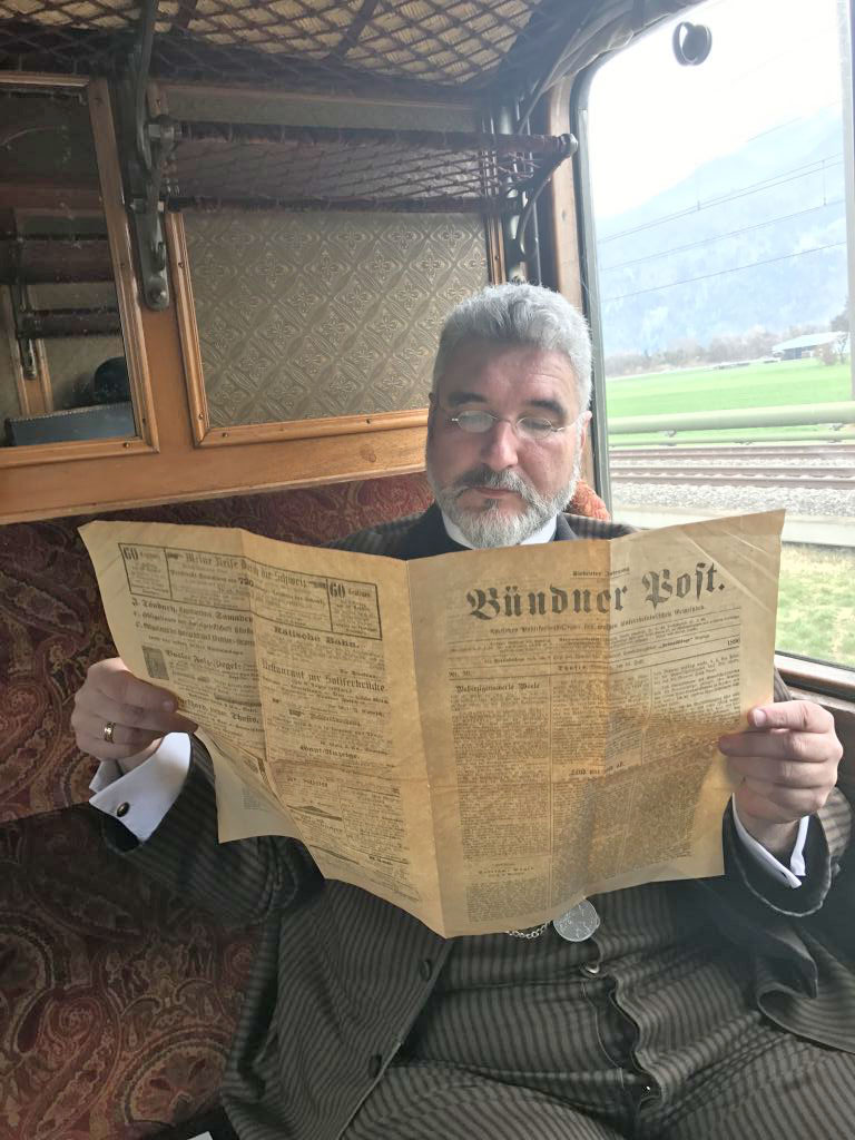 Der Aufforderung, in nostalgischer Kleidung zu kommen, kamen zahlreiche Reisende nach und sorgten an Bord für entsprechende Stimmung. Da wurden kleinste Details beachtet. Tobi Putzo, wurde beim Lesen der "Bündner Post" erwischt. Interessant, dass die Ausgabe vom 22. Juli 1896 älter ist als der Erstklasswagen A 1102, in dem er von Chur ins Engadin reiste. Der A 1102 wurde im Hinblick auf die Eröffung der Albulalinie im Jahre 1903 von der RhB angeschafft und in Betrieb genommen.